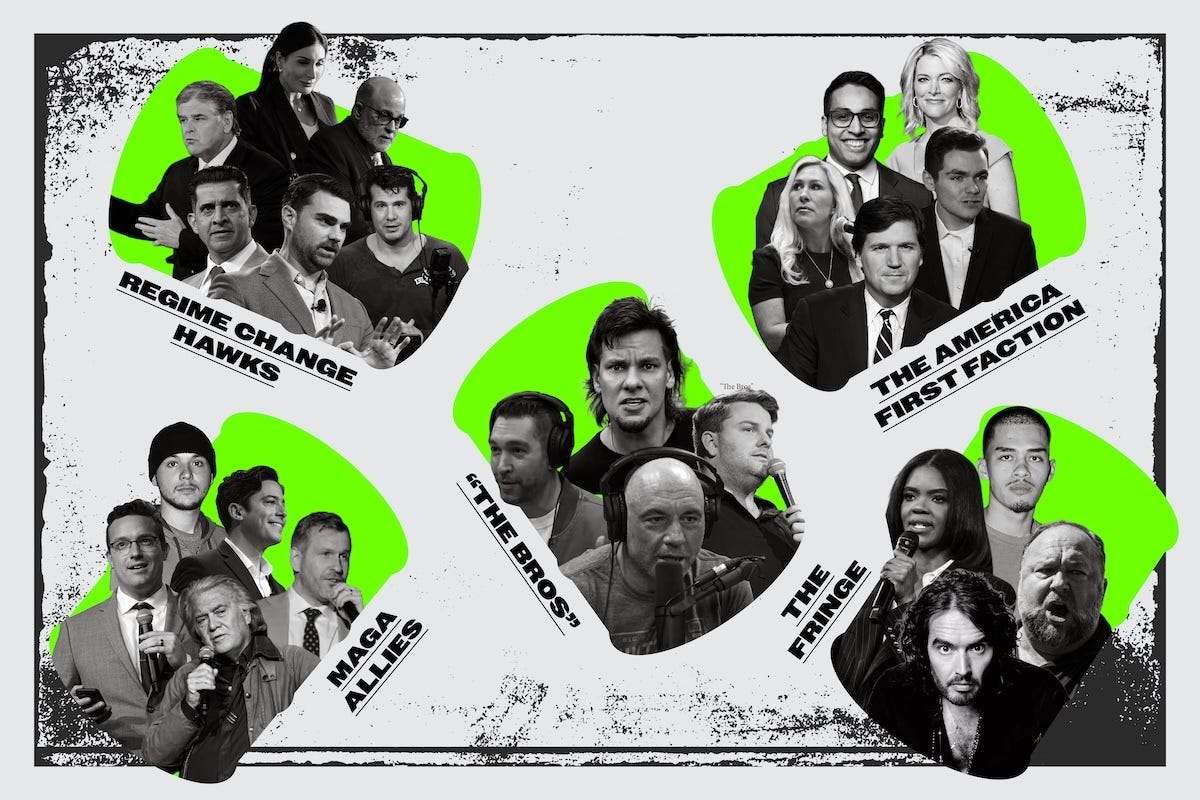 But not everyone agrees with Kolvet’s assessment of Kirk’s legacy. MAGA media has splintered into multiple feuding factions with conflicting views on the war in Iran. There are at least five main groups, which we’re referring to here as: